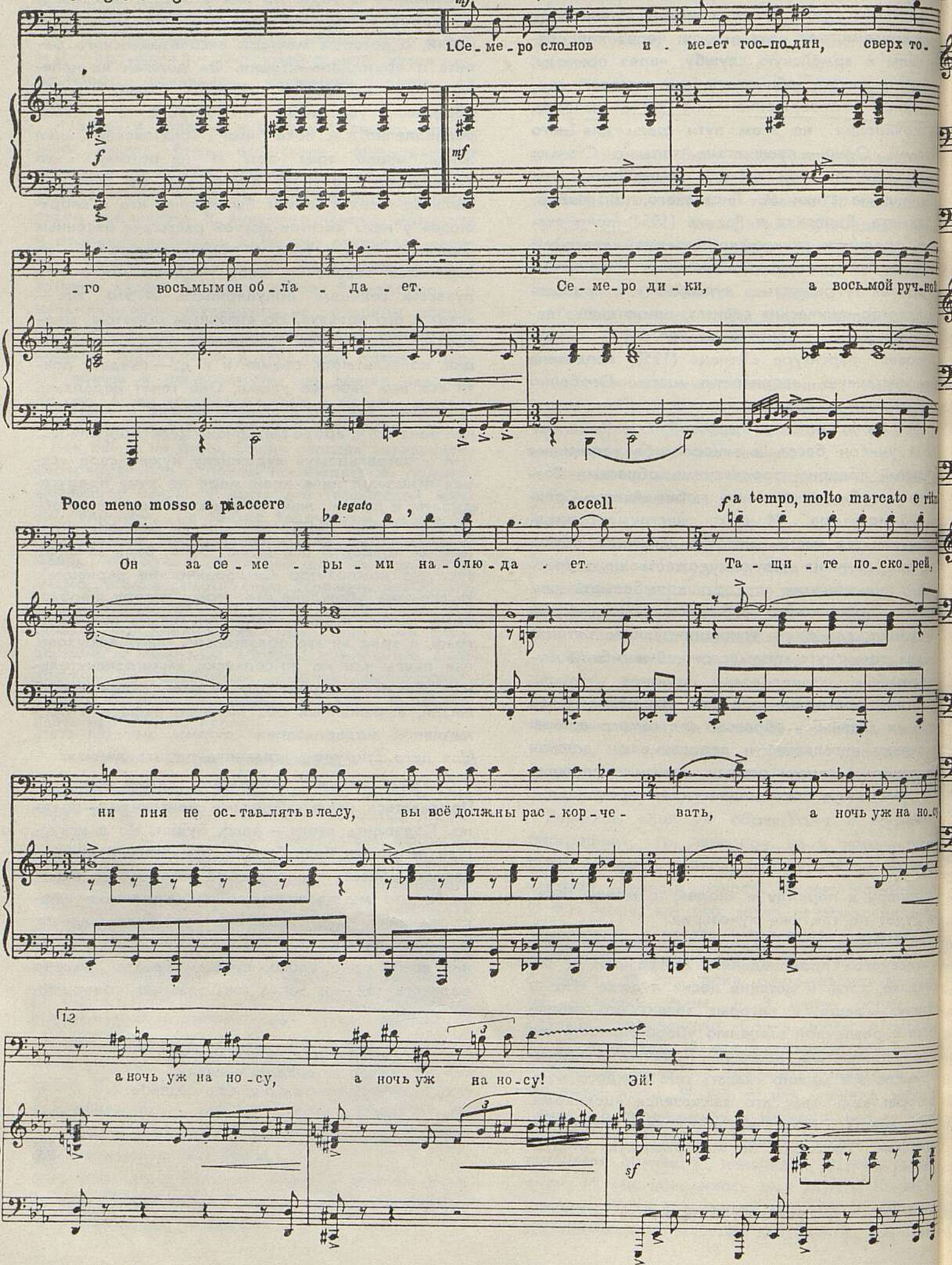 Хоровая партитура «Ленин» (1958) воплотила более пытливую творческую мысль. Особенно это относится к среднему номеру, «Пять ночей и дней». Во вступление вынесен pizzicat’ный октавный унисон басов и теноров, без сомнения навеянный траурно-героическими образами Бетховена — любимейшего из любимейших Солиным композитора. И чисто инструментальный прием, как это часто бывает в искусстве, обрел иной лик, получил новую художественную краску. А в кульминации «поверх» колыбельной кантилены и похоронного марша басов лег народный причет, где почти глиссандирующее интонирование достигнуто путем сложной и гибкой модуляции...