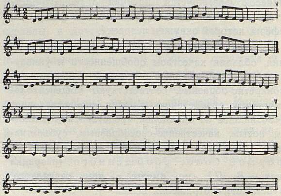 ческие фигуры которых состояли из четвертных и восьмых нот. К концу второго месяца ребята могли петь все упражнения в трех тональностях: ре, ми и фа мажоре. (До мажор мы намеренно исключили из упражнений, хотя устно, то есть без написания на доске и в тетрадях, ребята пели это тоническое трезвучие и звукоряд.) В начале третьего месяца был проведен проверочный эксперимент. Предстояло выявить, насколько прочен у детей той и другой группы «сплав» зрительного и слухового компонентов в представлениях, а также определить, какая группа более мобильно оперирует этими представлениями в процессе сольфеджирования, то есть умеет выделять знакомые комплексы нот в предлагаемой для пения с листа мелодии. Надо было также сравнить качество сольфеджирования при сознательной ориентировке на комплексы и при обычной методике пения от ноты к ноте. Ниже привожу комплексы-попевки, из которых составлялись упражнения и примеры, применявшиеся в тренировочный период, а также две мелодии, использованные в проверочном эксперименте ■:
