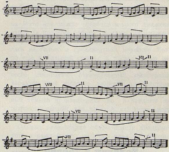 комплексы из трезвучий, чередуя их с движением мелодии по звукоряду, два упражнения с использованием скачков на II и VII ступени (движение мелодии по звукоряду), две мелодии с использованием комплексов из трезвучий, звукорядов, а также скачков на II и VII ступени. Все упражнения и мелодии надо было прочесть с ориентировкой на комплексы, смотря на такт вперед и дирижируя рукой 2 , а наиболее понравившуюся мелодию выучить на память.