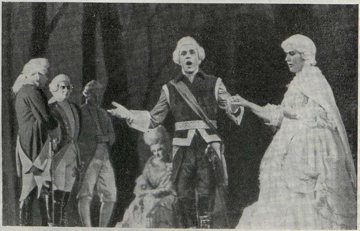 Но, к сожалению, таким видением подтекста были отмечены далеко не все сцены! Отдельным картинам не хватало внутренней контрастности, точного осознания противоборствующих сил. Казалось бы, удачно найден эпиграф — бесстрастная, загадочная карта, неизменно открывающая каждую картину. После него особенно рельефно ощущаешь пестроту и суету пустой светской жизни. Однако в самом действии эти страшные роковые силы почти не ощутимы. А ведь уже острая смена ситуаций, мелькающих подобно кадрам в первой картине или сцене бала, давала богатые возможности для раскрытия резких образных контрастов. Именно здесь можно было бы проявить остроту и современность режиссерской мысли. Но в периодическом появлении Германа и Томского в первой картине было даже нечто старомодное, условно-оперное. Как, впрочем, и в том, что хор поворачивался спиной к залу, давая возможность Герману объясниться с Лизой на балу. И встречи Германа с графиней не нашли необходимого сценического воплощения — они происходили все на том же изящном, безмятежном фоне. Сама же графиня трактуется в спектакле в излишне бытовом плане.