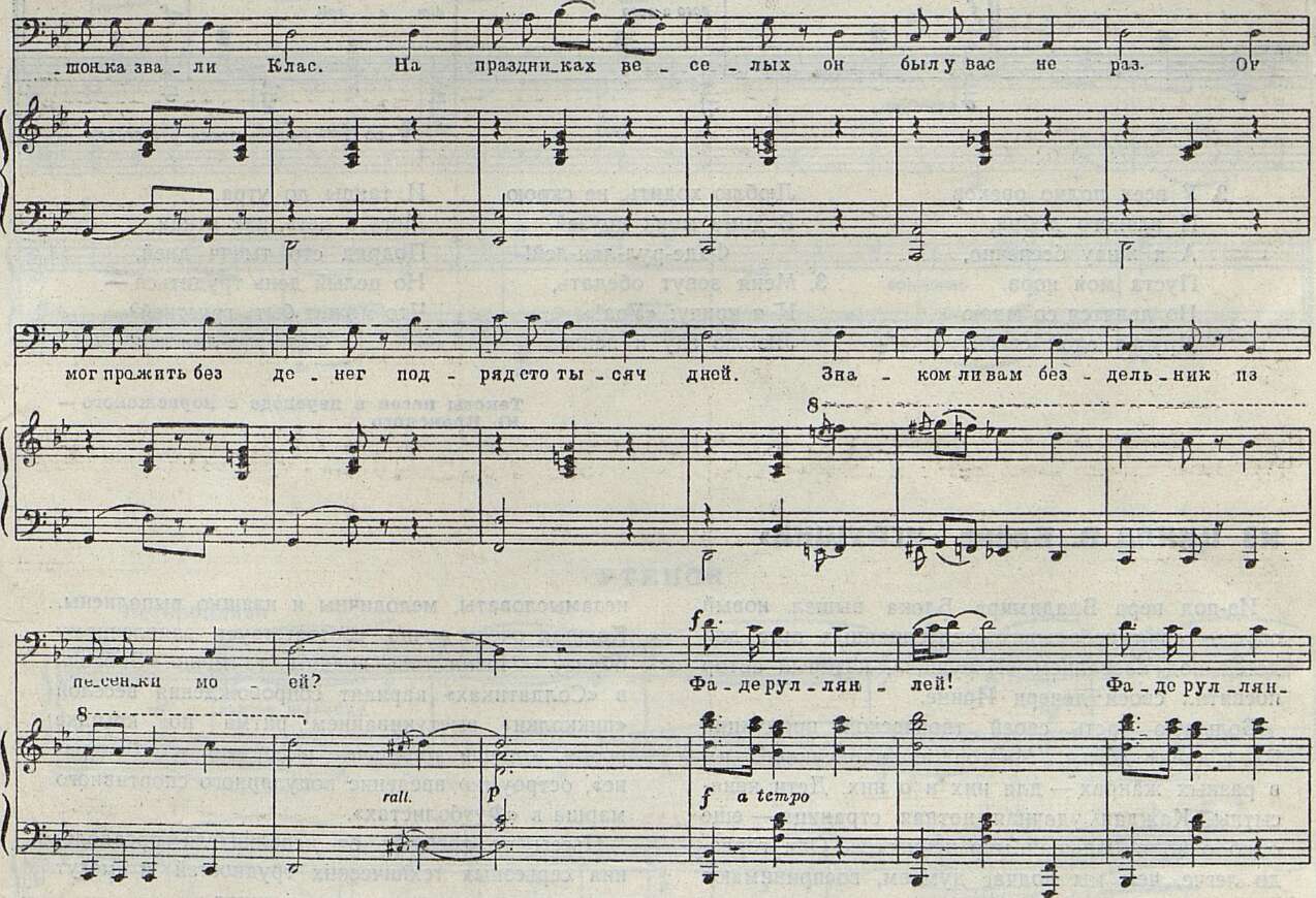 И танцы до утра. Могу я петь, как птица, Подряд сто тысяч дней, Но целый день трудиться Что может быть грустней? Фаде-рул-лян-лей!