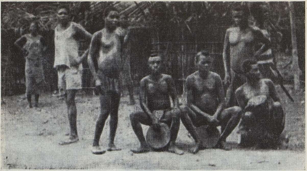 Постепенно со всех сторон стали появляться остальные жители селения. Все они небольшого роста, кожа — темнс-шоколадного цвета; бедра перевязаны тонкой веревочкой из травы, на которой держатся пучки свежих листьев. Никаких тканей, лишь на одном пигмее рваная майка и такие же рваные штаны, а на голове — остатки фетровой шляпы. Вероятно, он был навеселе. Очень много ребятишек. Самые маленькие — привязаны к телу матери. Начинается танец. Дробь тамтамов неумолчно прорезает тишину полуденного тропического лета, вызывая из чащи все новых и новых обитателей. Круг танцующих становится все шире. Возникает песня. Танец среди бела дня — исключительное событие. Это в честь приезда гостей. А может быть, потому что мы привезли с собой мешок соли: ведь соль — до сих пор самый драгоценный подарок для пигмеев, живущих всегда в отдалении от людей и почти не выходящих из леса. А гости бывают здесь, конечно, не так уж часто. И не удивительно: пигмеи — кочевники. Долго ли пробудут они на одном месте! Скоро они переменят стоянку, и кто знает, где их можно будет разыскать! Да и кто, собственно, будет этим заниматься!