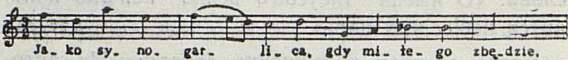 Петербургская рукопись свидетельствует о прочной связи автора «Грамматики» с польской музыкальной культурой и проливает свет на творчество некоторых польских композиторов. Так, говоря об использовании мелодий светских (народных) песен при сочинении духовных песнопений, автор приводит отрывок из «мессы» неизвестного композитора Замаревича. Этот отрывок основан на напеве польской народной песни «В огрудечку была» 4 :