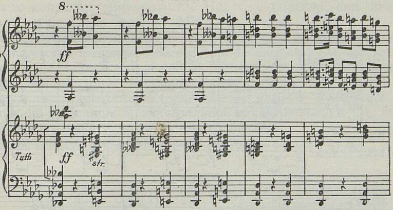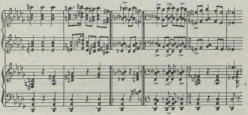 1 Нужно отметить в фортепианном изложении и развитии тем (особенно в каденции) заметное влияние пианизма Листа и Чайковского. По-своему разрабатывая мелодическую, гармоническую и ритмическую основу тематики концерта (в 1-ой ч.), Хачатурян довольно широко использует «готовые» пианистические приемы Листа и Чайковского (ср., напр., изложение главной партии у Хачатуряна — начало b-moll’ного концерта Чайковского — аккордовые эпизоды A-dur’ного концерта Листа и т. д.). В финале хачатуряновского концерта сильна другая — прокофьевская — тенденция сухого «токкатного» пианизма. Это, конечно, также не способствует укреплению стилевого единства фортепианного концерта Хачатуряна.