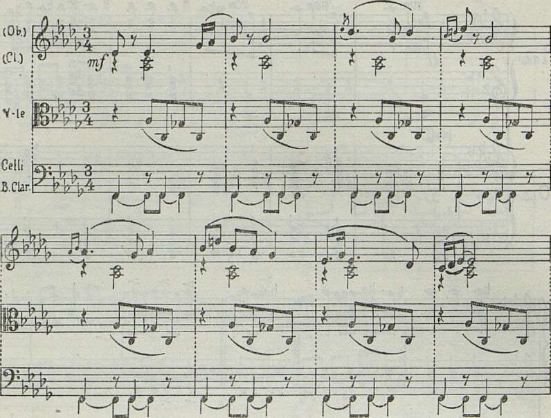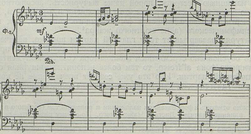 Как хорошо звучит лирическая мелодия в первом проведении побочной темы (гобои — в мягком окружении струнных; спокойный ритмический пульс, как бы подчеркивающий грациозное движение мелодии). И, насколько легкомысленно ее дальнейшее «развитие», настолько чужд певучей и простой мелодии тот изысканно модернистский гармонический наряд, который изобретен композитором для фортепианного изложения темы: (ср. прим. 9 и 10):