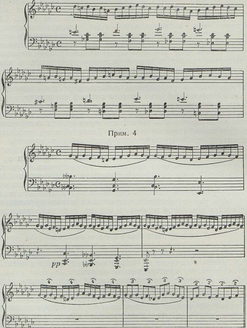 сопровождения) в данном случае означает переход к начальному эпизоду, т. е. к суровому изложению «Dies irae». В нотном примере отмечены фигуры, представляющие все ту же «роковую» тему. Благодаря одноголосному изложению, прежняя ладовая окраска созвучий уменьшенного лада предается забвению и орнаментальная фигура узкого диапазона естественно «вливается» в es-moll последнего раздела.
