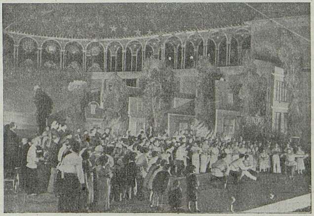 Своеобразная кино-интермедия: белый занавес-экран закрывает картину веселого пиршества. Небольшой киномонтаж показывает деятельную подготовку колхоза к Сельскохозяйственной выставке и приезд в Москву лучших ударников социалистических полей. Этот фильм вводит в последнюю сцену колхозного представления — торжественный финал, утверждающий тему торжества социалистического земледелия и нерушимой дружбы братских народов Великого Союза Советских Республик.