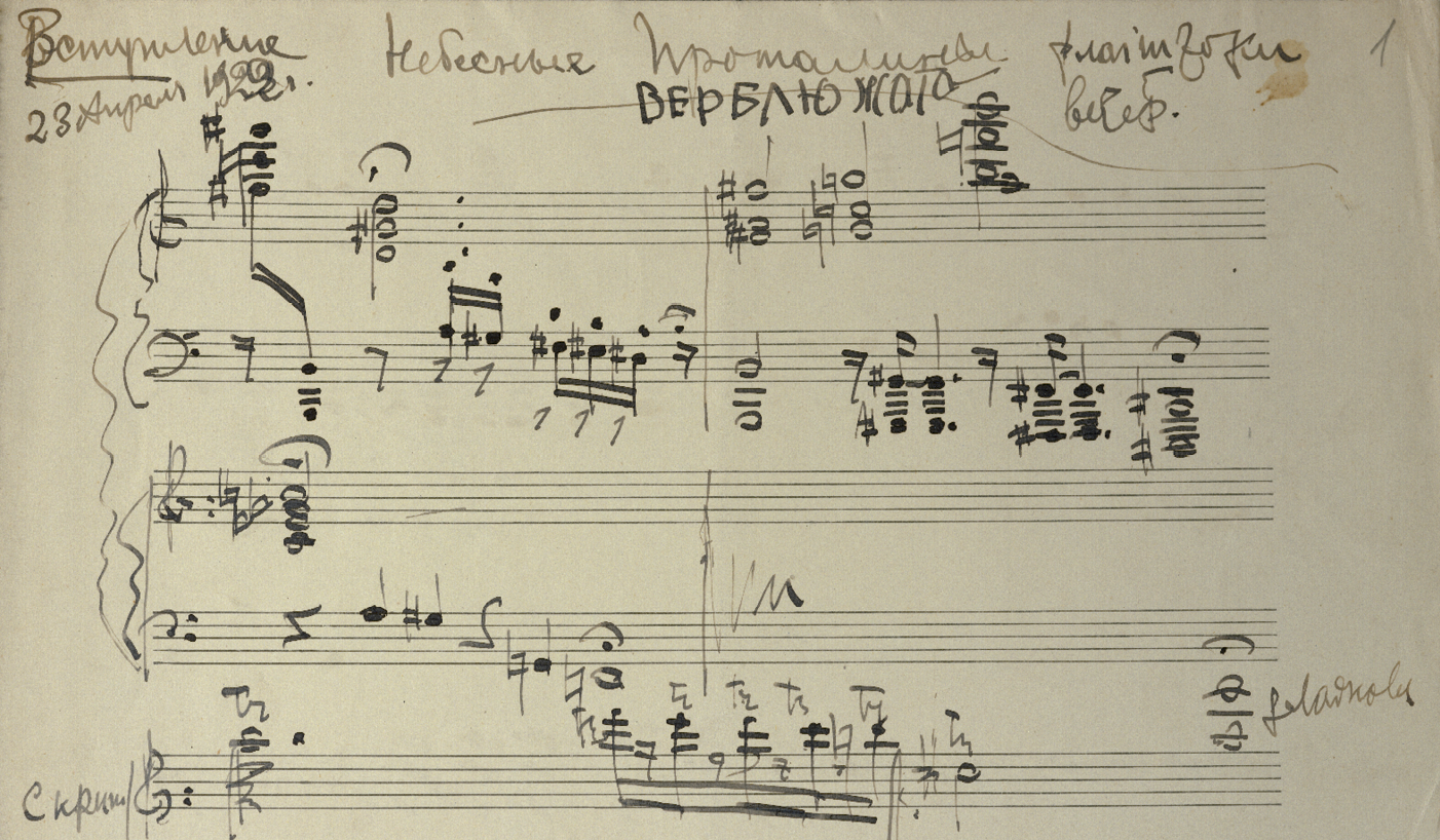 Так или иначе, в опусах последнего десятилетия своей жизни он уже не достиг художественных высот начала 1920-х (вероятно, и не стремясь к этому). Потому-то столь важным представляется введение в научный оборот, исполнение и изучение сохранившихся номеров из «Небесных верблюжат» — последнего крупного музыкального проекта Михаила Матюшина.