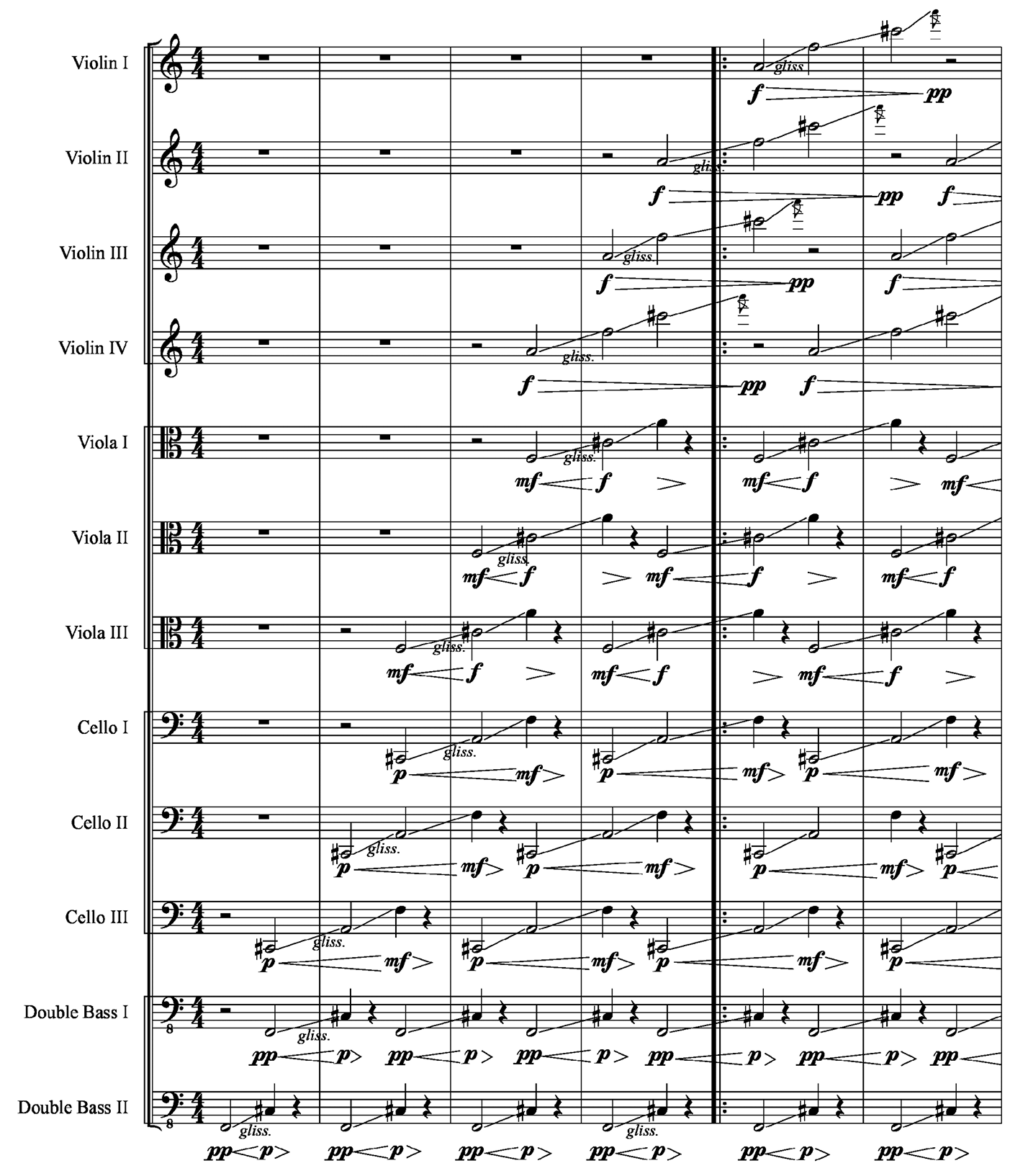 Пример 7. Дж. Тенни. «Для 12 струнных (восхождение)», (такты 1–6)