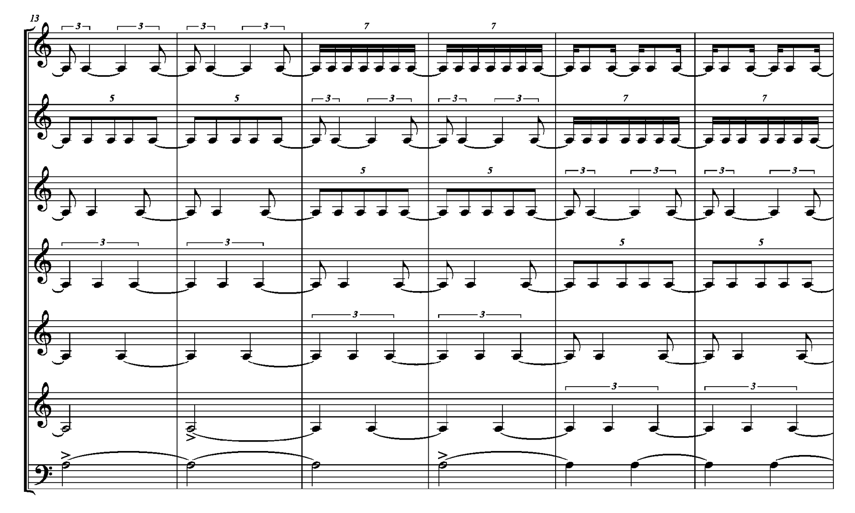 Этот же прием Тенни использует и в Септете — для более «устойчивых» звучаний определенных гармоник три гитары из семи настроены немного ниже остальных (на 14, 49 и 31 герц ниже, чем принято обычно). Звуковысотный состав произведения основан на обертоновом ряде звука A₁. Первый раздел пьесы представляет собой ритмический канон в унисон: все инструменты вступают поочередно нисходящей «лесенкой», исполняя один и тот же звук (ля малой октавы). В результате в процессе смены ритмических рисунков в голосах образуется плотная полиритмическая фактура.