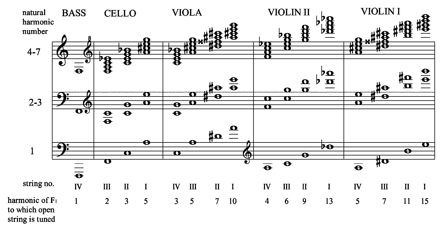 Пример 2а. Скордатура и гармоники струнных, используемые в «Spectra for Harry Partch» [29, 98–99]