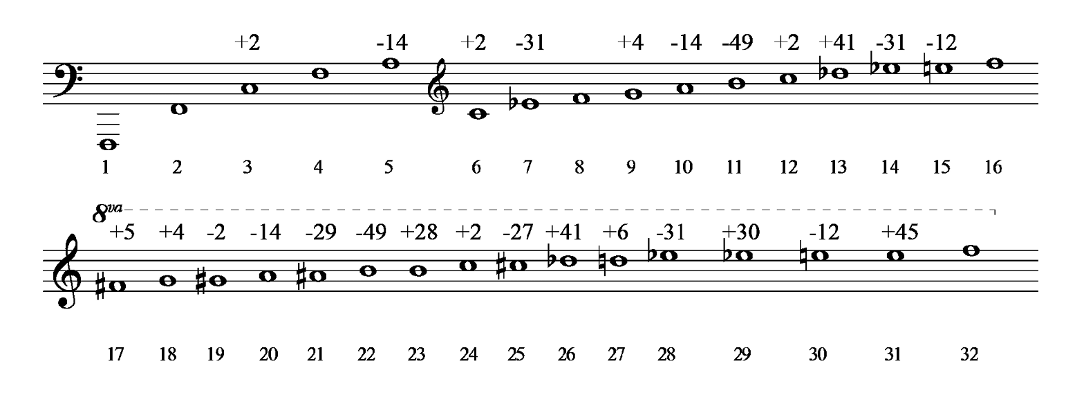 Example 2b. The full pitch set of the composition (deviations from equal temperament in cents is indicated above the staff)