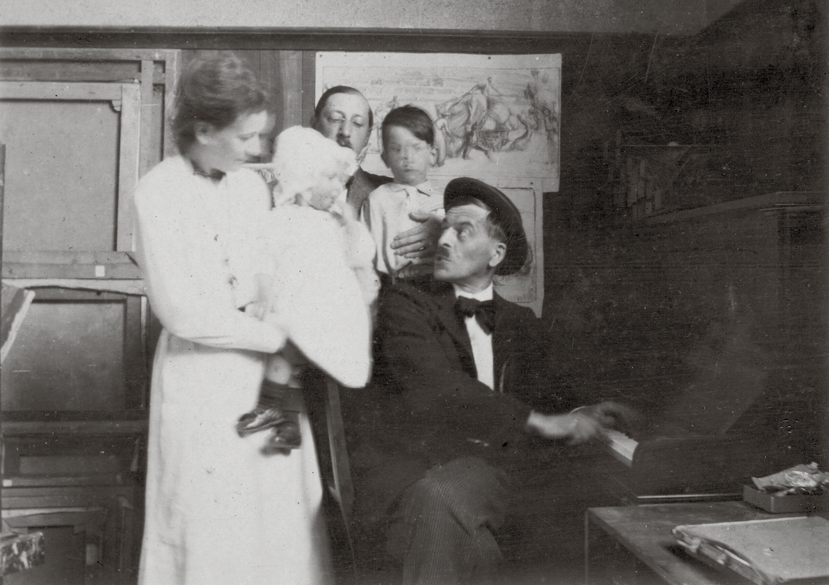 Fig. 4. C. F. Ramuz, Igor Stravinsky, Marianne Muret and her children in Albert Muret’s studio in Lens (Swiss), 1918.