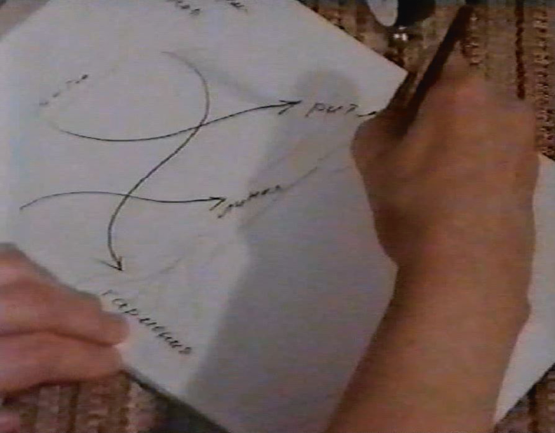 Илл. 2: Кадр из фильма «Огонь и роза». С. А. Губайдулина рисует «гомофонно-гармоническое древо»