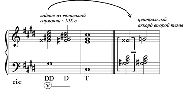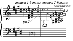 Господствующий тон второй темы — gis; таким образом, она написана, «как и положено», в доминанте. Тот же главный аккорд второй темы становится «структурной тоникой» для верхнего пласта фактуры. Отбрасываем органный пункт gis, тогда верхнее пятизвучие ais-cis-e-g-a представляет собой неполную вертикализацию уменьшенного лада «тон-полутон»:
