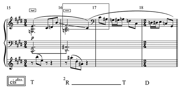 Здесь уже нет генерального затакта; форма этого фрагмента — двутактовая фраза с расширением. Здесь использованы два типа созвучий: один — описанный выше аккорд cis 4.3.3.3.2 (в полутонах), другой увеличенное трезвучие cis 4.4. Первая структура распространяется на два такта и гармонизует фразу с активным, живым мелодическим контуром, в котором различаются легкий (первый) и тяжелый (второй) такты. Как уже сказано, гармония, обозначенная во втором такте как ²R, — репликата тоники, ее дублировка тоном выше. Холопов подчеркивал, что это ни в коем случае не DD, потому что «функция — это не состав звуков, а поведение». Аккорд второго такта с основным тоном Dis никак не обнаруживает свою связь с доминантой, это не «родня» доминанты, но «сосед» тоники. Мы ведь буквально слышим целотоновую связь основных тонов cis и dis, слышим и тождество вертикальной структуры — это и есть открывающееся на слух «чувство репликаты» как функции. Всякая гармоническая функция слышна — это звуковая проекция родства, отношения аккорда к аккорду. Невозможно подменять демонстрируемое двумя первыми аккордами реальное отношение прилегания (копирования, структурного отражения) существовавшей когда-то ранее в другой музыке связью через доминанту. Функция R слышна как раз не как тяготение к некоему центру, но как лишенное движения отражение тоники (заметим, целотоновое отражение).
