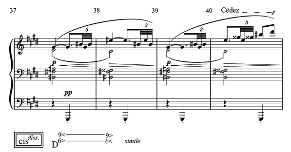 Example 21. C. Debussy, “Feuilles mortes,” dominant lead-in to the recapitulation