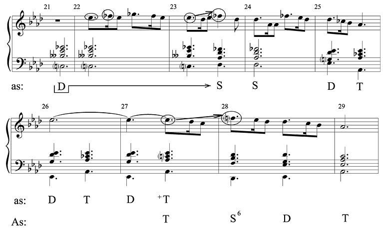 В экспозиционной части нас, можно сказать, тревожит судьба основного тона as — одержит ли он мелодическую «победу», вырвется ли из октавной «клетки», в которую заключил его «соперник» — тон es. Это напряжение снимается в каденциях второй части. Заметим, что в ней в мелодии уже нет нижнего es, а звук as как бы выпущен на свободу и возвратил себе достоинство тесситурного устоя: первая ступень лада теперь оказывается самым нижним звуком мелодии. Освобождение «финалиса» сопровождается важнейшим событием, о котором еще не было сказано, — ладовой переменой as-moll на As-dur, венчающей всю форму. Чувствуется, что перемена ладового наклонения обозначает крайние пункты гармонического сюжета, но то, что наполняет сам этот путь, нам только предстоит рассмотреть.