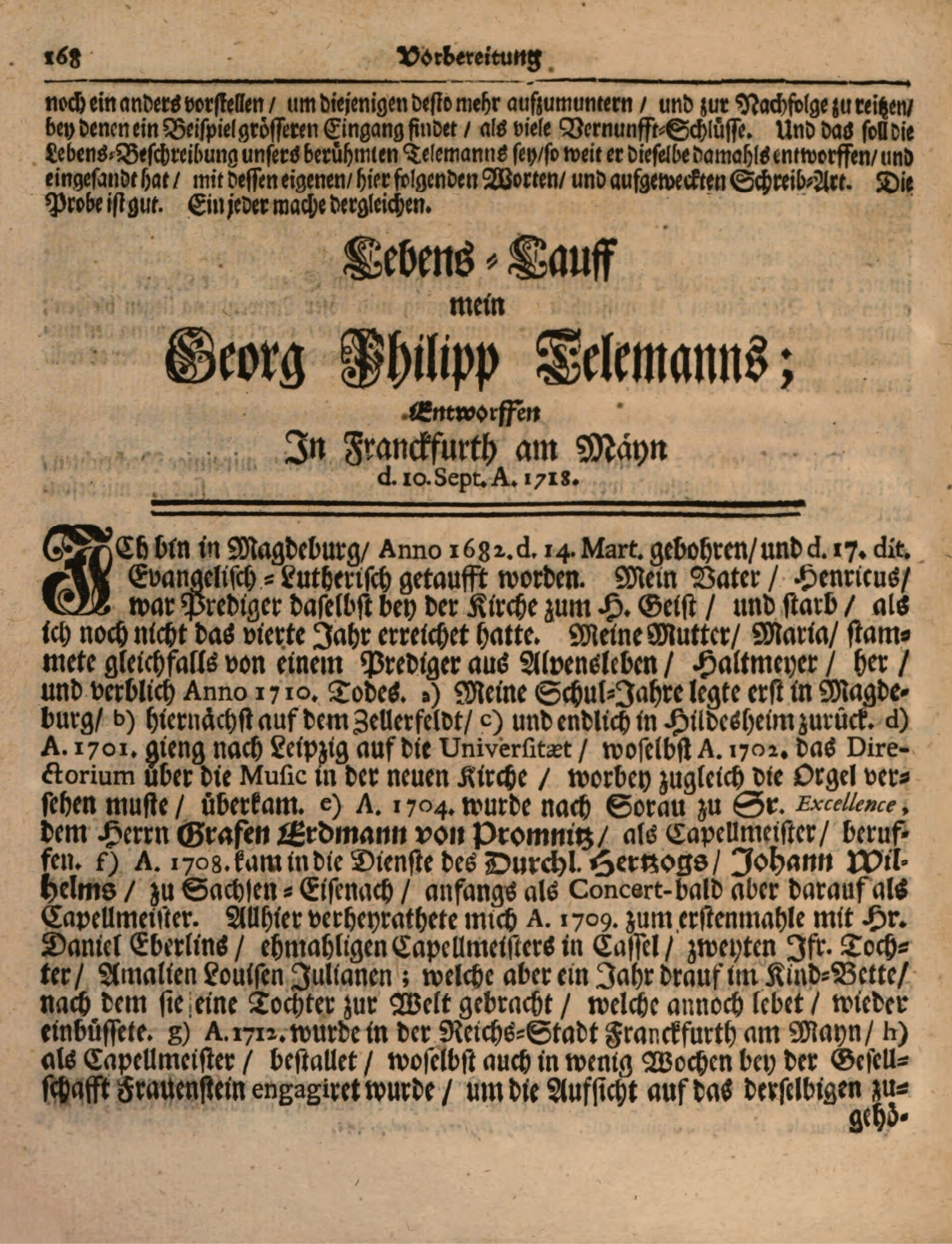 Я родился в Магдебурге в году 1682 14 марта 4 и крещен 17 числа того же месяца в евангелическую лютеранскую веру. Мой отец Генрих 5 был священником там же, в церкви Святого Духа, умер до того, как мне исполнилось четыре года. Моя мать Мария была дочерью Хальтмейера из Альвенслебена, тоже священника; умерла в 1710 году 6. А). 7 Мои школьные годы проходили сперва в Магдебурге, b) затем в Целлерфельде, c) и, наконец, в Хильдесхайме. D). В 1701 году я поступил в Лейпцигский университет; там же в 1702 году приступил к работе в качестве музыкального руководителя в Новой церкви, при этом должен был также выполнять обязанности органиста 8. E). В 1704 году я был приглашен в качестве капельмейстера в Зорау к его сиятельству господину графу Эрдману Промницкому 9. F). В 1708 году поступил на службу к его светлости герцогу Иоганну Вильгельму Саксен-Эйзенахскому 10 сперва в качестве концертмейстера, а затем и капельмейстера. Здесь в 1709 году я впервые сочетался браком со второй дочерью господина Даниэля Эберлина 11, бывшего кассельского капельмейстера, девицей Амалией Луизой Юлианой 12. Но спустя год после рождения [нашей] дочери, живущей до сих пор, она скончалась, так и не оправившись от родов 13. G). В 1712 году был принят во Франкфурте-на-Майне h) на должность капельмейстера, где через несколько недель был приглашен в общество «Фрауэнштайн», чтобы выполнять некоторые хозяйственные поручения, в частности, присматривать за принадлежащим этому обществу домом, в котором имели обыкновение останавливаться императоры Священной Римской империи для выборов либо коронации. И поскольку члены указанного Societaet [общества] были назначены Executores [распорядителями] considerablen [внушительного] и ad pias causas [для благих целей предназначенного] наследства, то они же доверили мне управлять процентами, что приносят им их дела 14. Здесь же впоследствии мне доверили руководство музыкой в соборе Святой Катарины — втором по значимости евангелическом кафедральном соборе. Для этого должность директора была учреждена à part [специально] 15. И наконец, упомянутый Его Высококняжеская Светлость герцог Эйзенахский вновь проявил милость, назначив меня своим капельмейстером, вследствие чего отсюда я отсылал [ему] необходимые ноты как для церкви, так и для камерного [музицирования]. Здесь в 1714 году вступил во второй брак с Марией Катариной, старшей дочерью господина Андреаса Текстора 16, учетчика при господских закромах. Имею трех сыновей, поныне здравствующих 17, и т. д.
