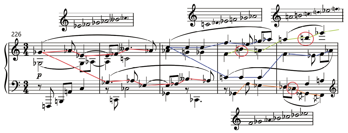 Иногда к необычной орфографии приводит полифония квазитональных мелодических построений 6. Например, в тактах 229–230 Пятой сонаты на крайне близком расстоянии соседствуют звуки h и ces (см. пример 6). Это объясняется тем, что каждая из линий основана на самостоятельном диатоническом звукоряде.