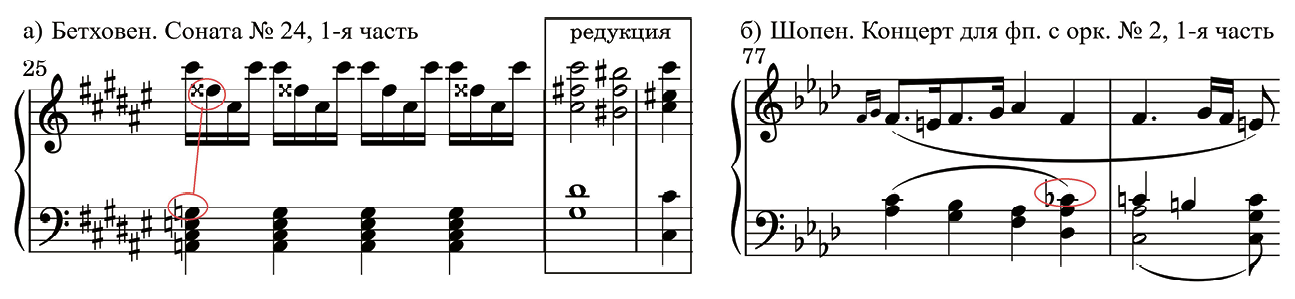 Ясность и быстрота считывания интервала терции, при нотации которого нотные головки не мешают друг другу, возможно, делает менее привлекательной запись секунд. Напомним, что даже композиторы XIX века нарушали очевидную ладовую орфографию для сохранения терцового принципа записи четырехзвучных аккордов. Например, в такте 25 первой части Сонаты № 24 Бетховена можно встретить одновременно g и fisis. А во Втором фортепианном концерте Шопена (первая часть, такт 77) в тональности фа минор использован звук ces (см. пример 3а, б).