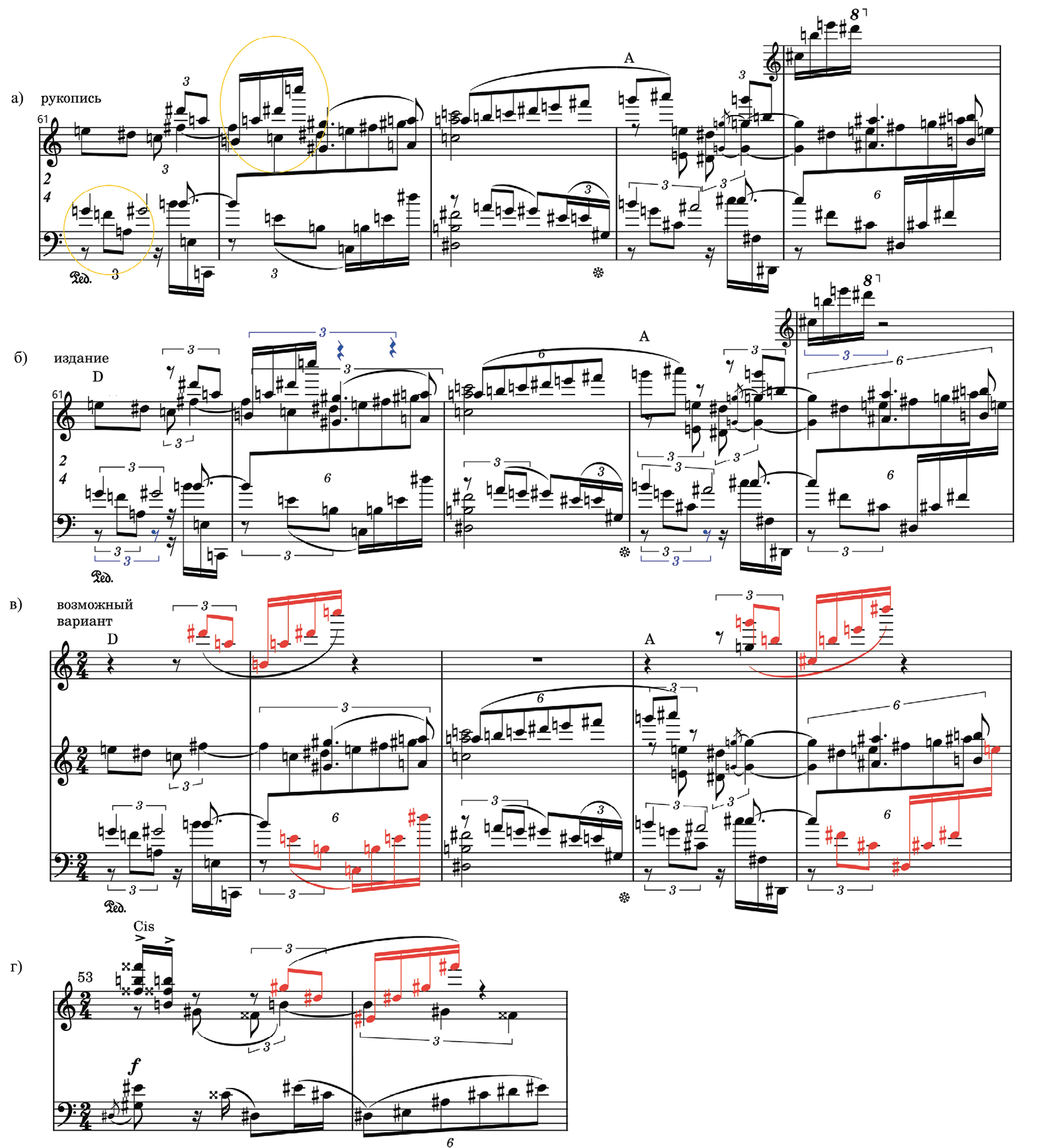 «Новые ритмоформы» нередко образуют трансцендентальные по сложности для исполнителя ритмические комбинации. К тому же отсутствие последовательной записи особых видов ритмического деления запутывает их интерпретацию. Некоторые виды мультиолей не обозначены и считываются из контекста — по положению нот относительно друг друга (см. примеры 9a, б) 10. По цитированным в начале статьи словам композитора, к возникновению таких «ритмоформ» привела «новая полифония». Поэтому нахождение и поиск аналогичных мотивов в более простом фактурном оформлении проясняет намерение композитора. «Твердая» структура синтетаккорда сочетается с «твердым» ритмическим оформлением тематизма. Проблемный мотив в тактах 61–62 и 64–65 (в примере 9в выделен красным цветом) можно встретить ранее в тактах 53–54, где он трактуется однозначно и не подчиняется секстоли (пример 9г).