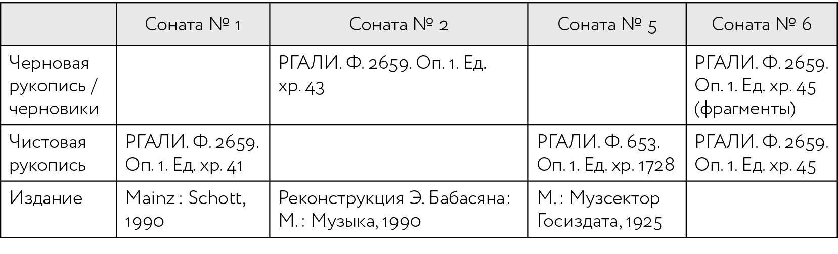 В данной статье будут рассмотрены сомнительные случаи в изданиях фортепианных сонат Рославца. Некоторые из них способны удивить исполнителя, о существовании других он может и не заподозрить. Считается, что композитором написано шесть сонат, две из которых (№ 3 и № 4) утеряны и одна (№ 6) не окончена. Для анализа проблемных в текстологическом отношении мест будут привлечены по мере необходимости несколько источников, полный их список приведен в таблице 1.