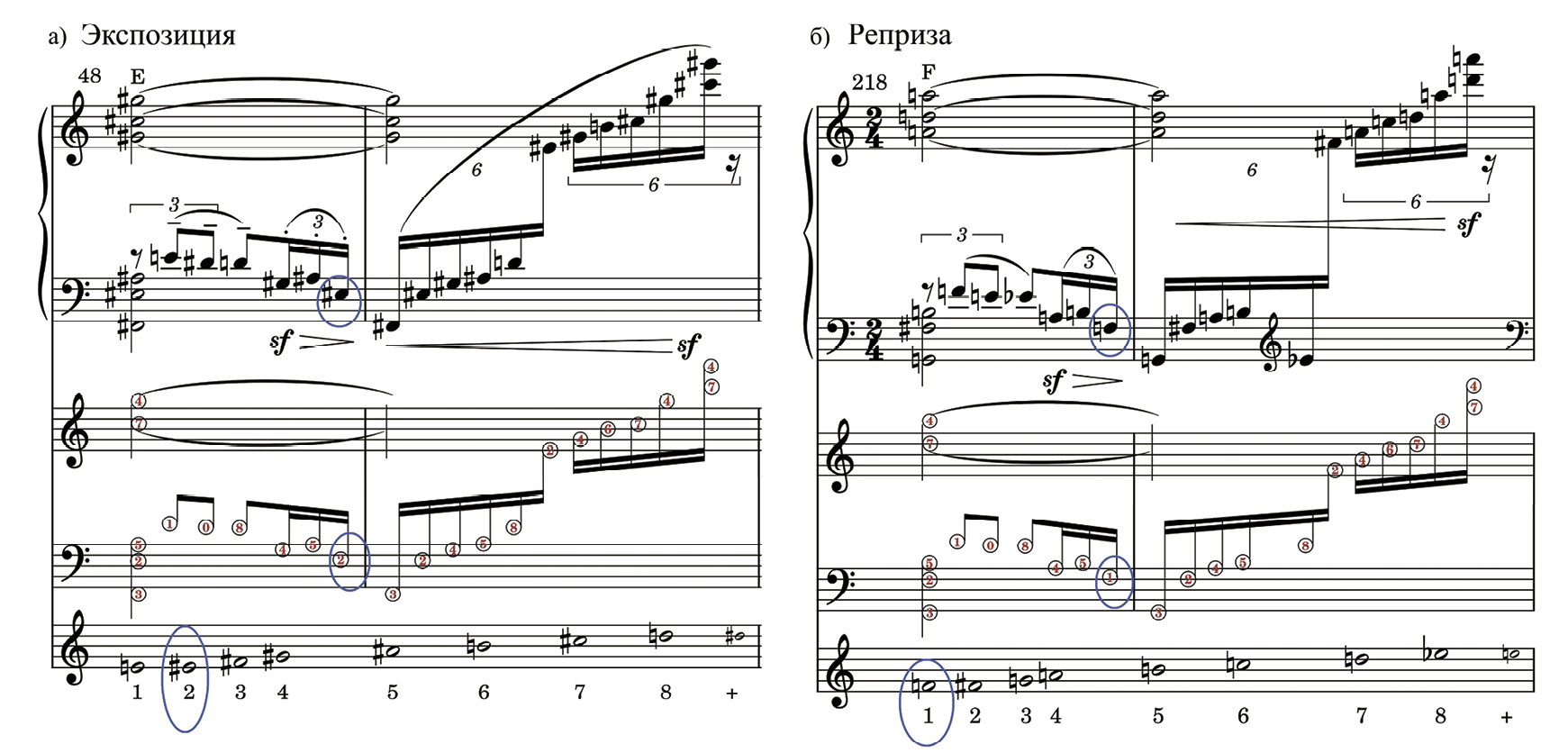 Сравнительный анализ аналогичных по тематизму фрагментов в экспозиции и репризе тоже дает свои плоды. Во всех сонатах при повторении побочной партии композитор часто переставляет материал местами, а в его внутреннюю структуру не вмешивается. Однако в такте 218 Второй сонаты транспонированный материал экспозиции повторяется неточно: звук f является коренным тоном синтетаккорда F {f–fis–g–a–h–c–d–es}, тогда как в аналогичном такте 48 — вторым от E {e–eis–fis–gis–ais–h–cis–d} (сравнить примеры 11а и 11б). Хотя структура синтетаккорда в обоих случаях не нарушается, предпочтительным выглядит вариант в экспозиции, где тон eis логично вписывается в гармоническую фигурацию.