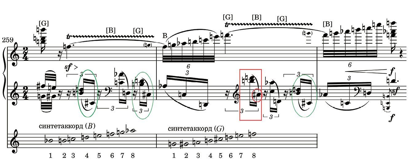 Пример 10. Н. Рославец. Соната № 2, такты 259–261
