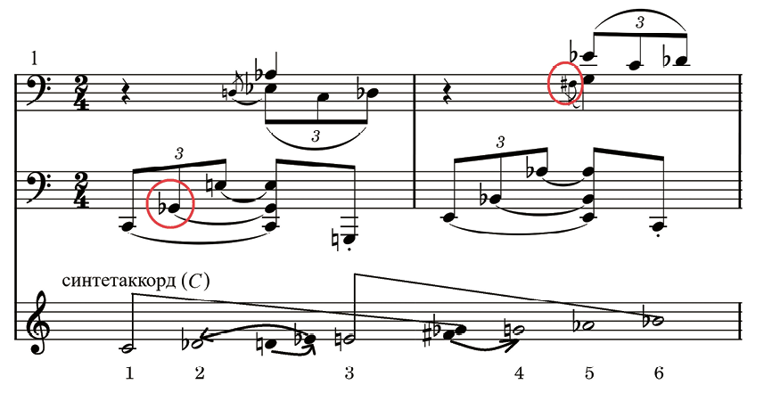 Еще одна видимая странность — наличие в пределах одного синтетаккорда энгармонически равных звуков — может быть связана с тем, что Рославец сохраняет дифференциацию тонов на аккордовые и неаккордовые. Так, в самом начале Шестой сонаты в двух соседних тактах находятся ges как тритоновый дубль баса и fis как вспомогательный звук к g (см. пример 5).