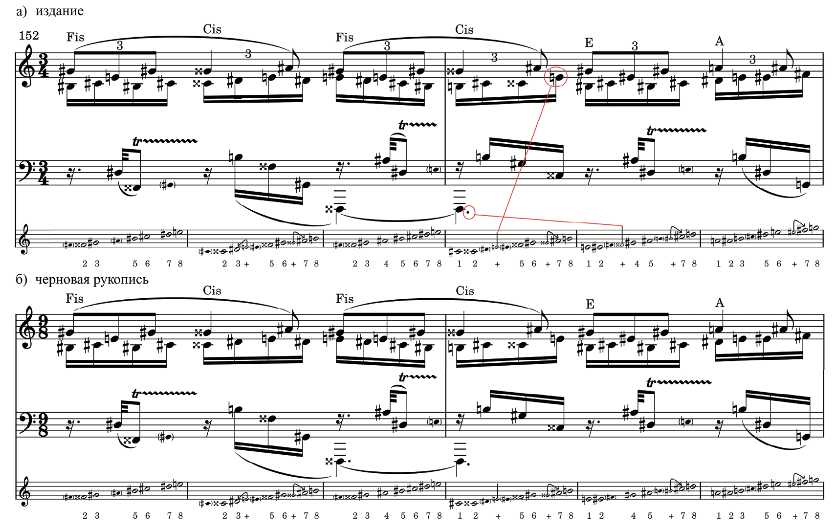 Ритмические опечатки также могут нарушать гармоническое единство. При реконструкции Второй сонаты редактор заменил перфектные размеры 3/8, 6/8, 9/8 соответственно на 2/8, 2/4 и 3/4 . При таких изменениях восьмые превратились в триоли, а дуольные шестнадцатые — в обычные 8. Все точки перфекции у четвертей были сняты, но в такте 153 имел место недосмотр, вследствие которого отмеченный в примере 8а звук попал на территорию чужого синтетаккорда. Обращение к рукописи (см. пример 8б) подтвердило, что точку в басу при ноте fisis следует убрать 9.