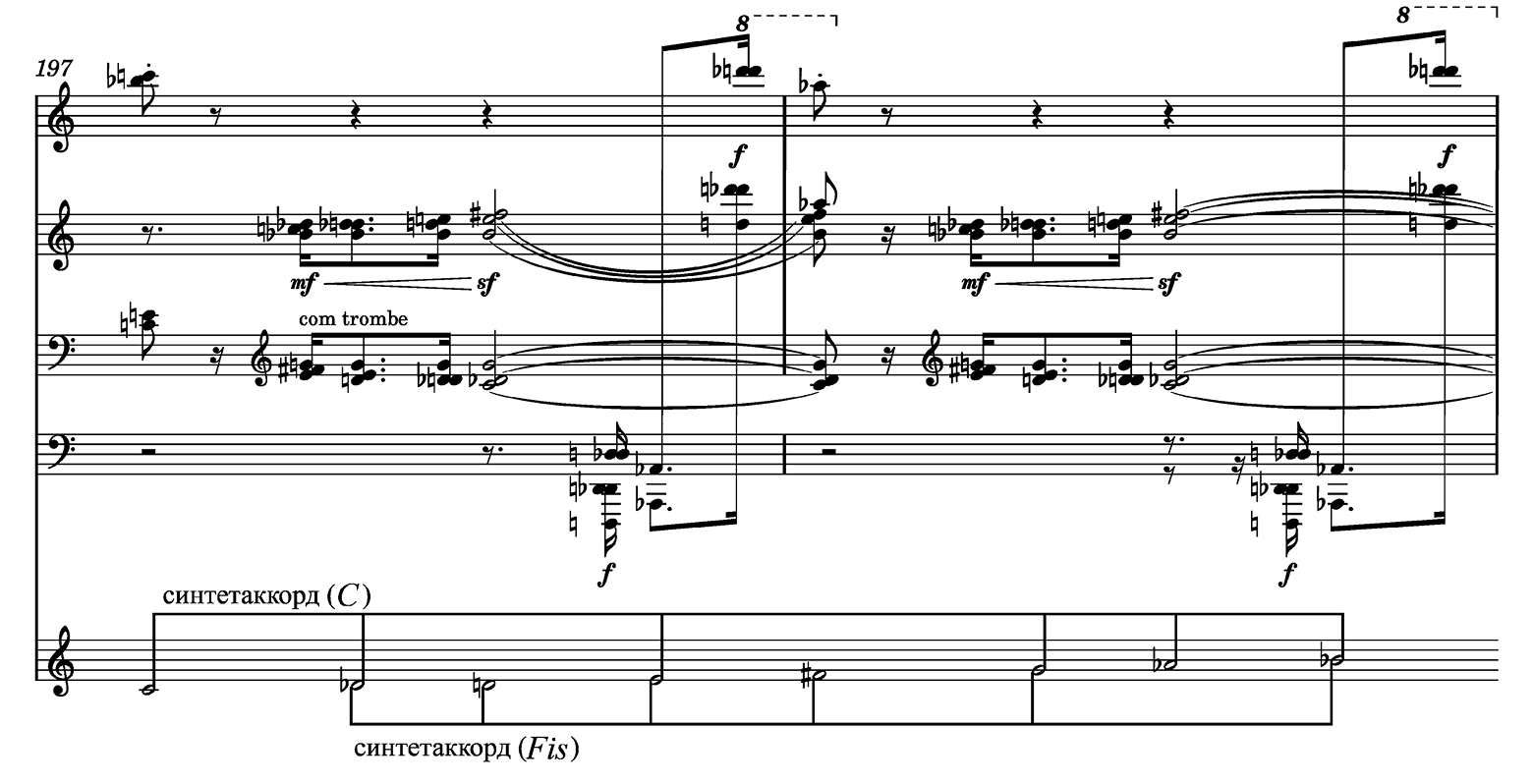 У Рославца же в 197-м такте Шестой сонаты мы находим созвучие {d¹–des²–d²} (см. пример 4). По инерции диатонического мышления звук des хочется заменить на cis. Однако в данном примере мы имеем дело с полисинтетаккордом {c–des–e–g–as–b} + {fis–g–ais–cis–d–e}, где d и des являются самостоятельными ступенями общего созвучия {с–des–d–e–fis–g–as–b} 5.