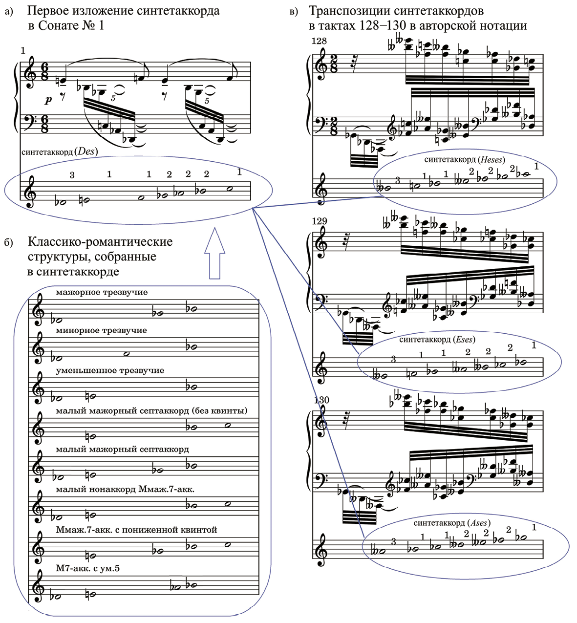 Для чего же композитор прибегает к столь экстремальному способу записи? В новых гармонических условиях Рославец все же остается верен диатонике: шестизвучный синтетаккорд представляет собой и лад — своеобразный аналог тональности 3. По нашим наблюдениям, логика транспозиций синтетаккорда имеет тональные прообразы. Так, в ходообразных построениях синтетаккорд транспонируется по чистым квинтам или чистым квартам; при этом сохраняется не только тоновая, но и ступеневая величина звуковысотного ряда 4. Композитор редко делает пассивную энгармоническую замену на более удобный для чтения вариант. Связано это с тем, что в условиях хроматической системы автору нужны средства для выстраивания крупной формы и маркирования ее разделов хотя бы для глаз — переходами из одного звукосостава в другой. В условиях, когда только центральный элемент расходует не менее половины своего резерва из двенадцати высот, тоновое поле для сонаты оказывается тесным, а впечатление полноценных хо́дов и масштабных разработок создается благодаря визуальному «путешествию» в диезную или бемольную стороны по кварто-квинтовому кругу синтетаккордов. Например, в тактах 128–130 Первой сонаты транспозиция главного синтетаккорда {des–e–f–ges–as–b–c} доходит до тона ases, что обуславливает следующий звуковой набор: {ases–b–ces–deses–eses–fes–ges} (см. пример 2а, б, в).