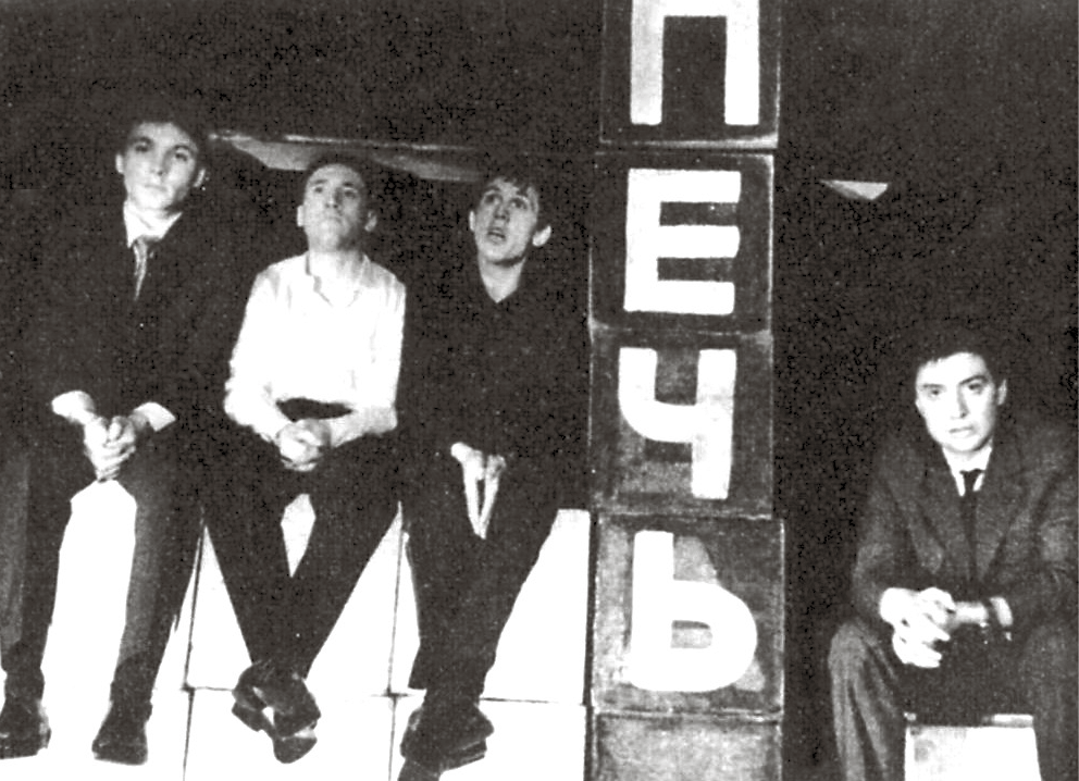 — Спектакль памяти Владимира Маяковского — о поэзии, о судьбе и о гибели его. Это один из самых сильных режиссерских спектаклей Юрия Любимова, а я был автором сценария по его просьбе. Нас было пятеро актеров, играющих разные грани личности Маяковского, в том числе Борис Хмельницкий, Валерий Золотухин и Владимир Высоцкий. У нас в руках были кубики — 32 кубика русского алфавита, на которые можно было встать, которые можно было даже бросить и поймать, и на них строились какие-то эпизоды. Например, в эпизоде «Зима, печь» на сцене вертикально было составлено слово «ПЕЧЬ» (см. илл. 1), и к нему примыкали двойные сидения по два кубика — на них сидели три или четыре Маяковских, а пятый — это был я — сопровождал происходящее стихами. Помимо кубиков, на заднике висел огромный Щен — очень симпатичная собака, которая была у Маяковского и Лили Брик. Есть даже знаменитый рисунок Маяковского, на основе которого и сделали декорацию. И этот Щен умел иногда реагировать, например, открывать рот и издавать какой-то будто львиный рык. По-моему, движениями глаз тоже можно было управлять из-за кулис. В этом детском дизайне и происходило соединение стихов и мизансцен. Любимов включал в игру все, что было на сцене в театре, — работали все детали декорации. Этот спектакль имел очень счастливую судьбу, его любили все.