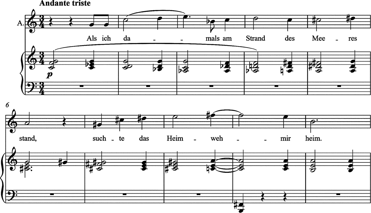 Ария, созданная Максом, погружает в своеобразную страну грез, мир ледяных гор, который так близок художнику-одиночке. С музыкальной точки зрения «Als ich damals» также выделяется в интонационном контексте всей оперы. Она, как отмечает Тейлор-Джей, является воплощением «искусства, оторванного от реальности» [19, 110], и не имеет прямого отношения к драматическому развитию оперы. Даже по сюжету ария «географически» обособлена, ведь Макс сочинил ее рядом с ледником — тем местом, которое противопоставляется реалиям современности: парижскому отелю, железнодорожному вокзалу, полицейскому участку.