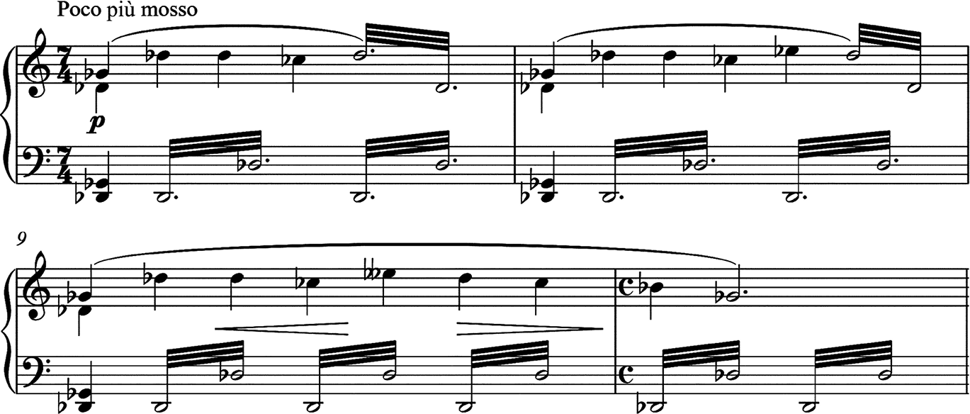 Example 2. E. Krenek. “Jonny spielt auf.” Introduction fragment. Leitmotif of the glacier, measures 7–10